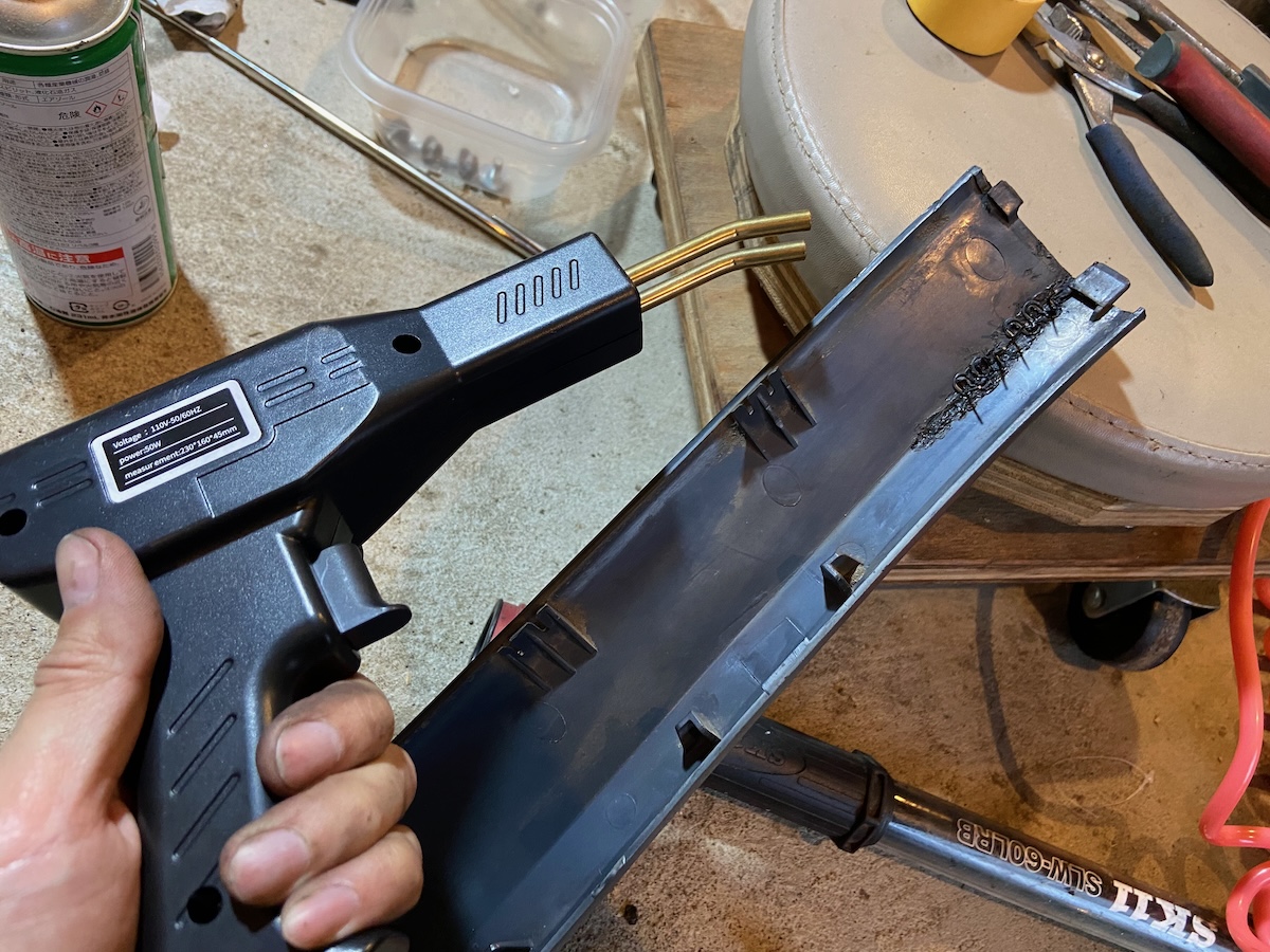 つや消し黒のアンダーカウルは適当な補修でも誤魔化せますが、アッパーカウルは車の板金同様に丁寧に補修します。割れた部分をプラ接合機で溶着し、その痕跡や傷をポリパテで補修。